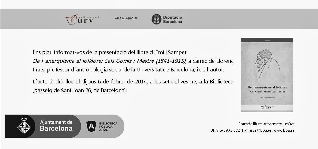 Dijous 6 de febrer, a les 19:00 h., es presenta el llibre De l'anarquisme al folklore. Cels Gomis i Mestre (1841-1915) d'Emili Samper a la Biblioteca Pública Arús de Barcelona.